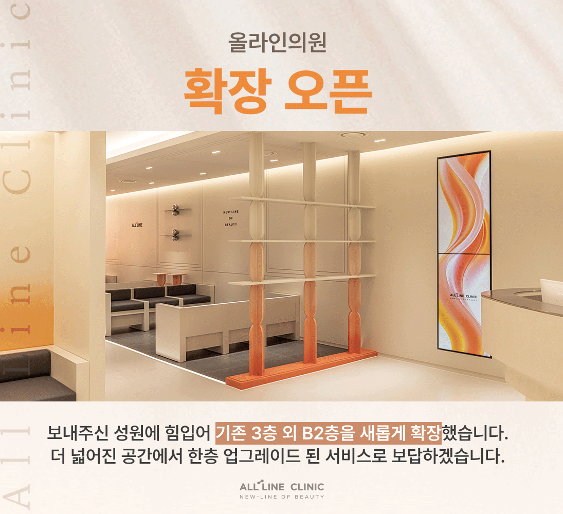올라인 의원이 기존 3층 외 B2층을 새롭게 확장했습니다! 더 넓고 쾌적한 공간에서 여러분의 소중한 시간과 아름다움을 위해 보다 차별화된 서비스를 준비했으니 앞으로도 올라인의원에 많은 기대와 관심 부탁드립니다 :)