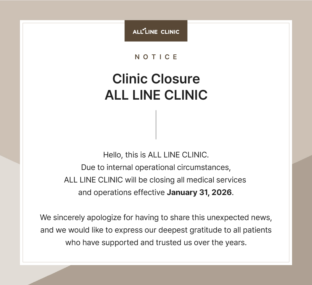 ![]() Hello, this is ALL LINE Clinic. Due to internal operational circumstances, our clinic will be closing all medical services and operations as of Saturday, January 31. 1. Refund Information for Unused Tickets and Remaining Prepayments •Application deadline: Saturday, January 31, 2026 •How to apply: Submit via Google Form https://forms.gle/v4xCmcziHstZhkkn6 •Required documents: Proof of identity (e.g., ID card) •Refund processing schedule: Refunds will be processed and deposited sequentially starting in early February, in the order applications are received. 2. Medical Record Retention and Copy Issuance ■ In-clinic issuance period: Even after operations end, copies of medical records can be issued directly at the clinic until Friday, February 13, 2026. ■ Required documents: For personal requests: Identification (additional documents may be requested depending on circumstances) -Record storage and issuance after February 13: After February 13, medical records will be preserved electronically in accordance with medical law. -How to obtain records after closure: Records may be issued through the relevant public health center after identity verification -Identification is required for issuance, and additional documents such as a power of attorney may be required for representative requests. 3. Inquiries ■ [ALL LINE Clinic] WhatsApp: +82 10-9064-4723 Due to a high volume of inquiries, phone connections may be difficult, Please leave a message via WhatsApp, and we will respond in sequence as soon as possible. We will do our utmost to ensure minimal inconvenience until the very end.